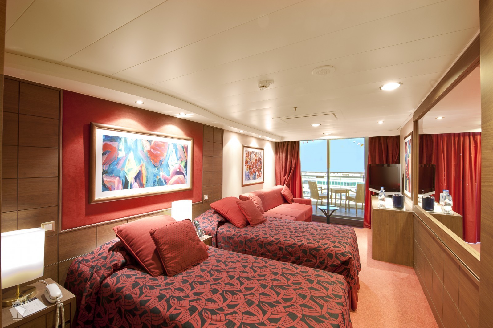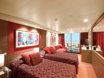 Suite s balkónom: cca 31m² kajuta s manželskou posteľou (na požiadanie 2 oddelené postele) a rozkladacia pohovka. Klimatizácia, kúpeľňa s vaňou, toaletný stolík, priestorná skriňa, TV, telefón, minibar, sejf, sušič na vlasy. Balkón so stolíkom a stoličkami. Internetové pripojenie (za poplatok).