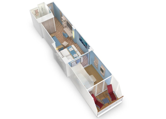 JA - Junior-Suite s balkónom PREMIUM 34 m² + terasa 27,5 m². 8. až 15. paluba. Max 4 osoby. Cenový model Premium + výhody Junior Suite. | 5 590 € 2 795 € za osobu |