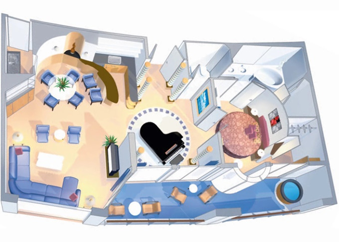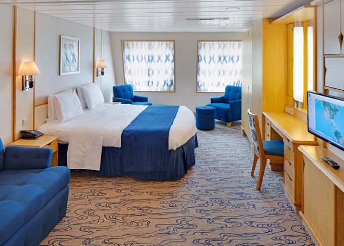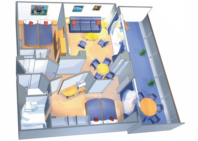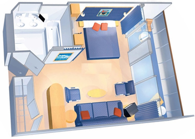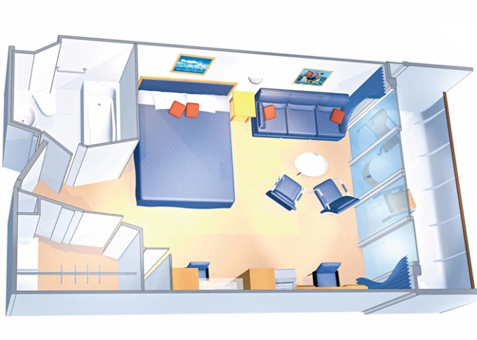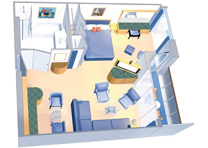 VP - Ocean View Panoramic Suite (bez balkónu) 37 m². Panoramatické neotvárateľné okná. Oddelená časť s poschodovou posteľou. Extra WC. 12. paluba. Max 6 osôb. Výhody Suite. | 6 424 € 3 212 € za osobu |