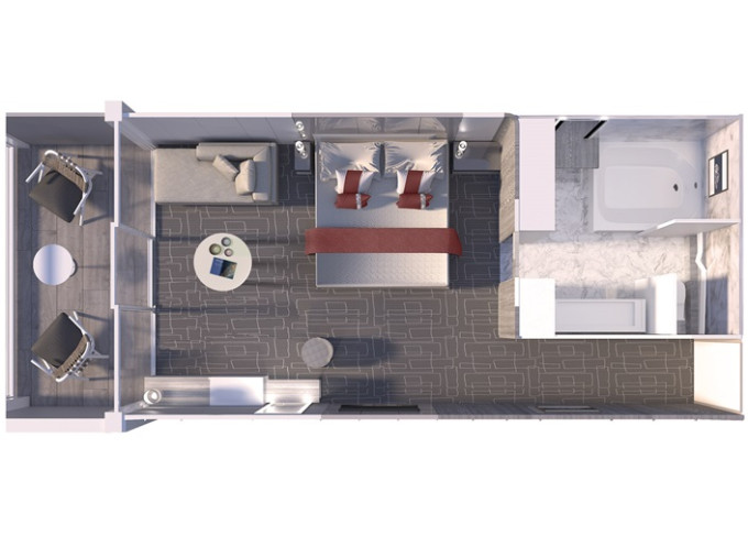 S1 - Sky Suite 30 m² + balkón 7 m². 7. až 12. paluba. Max 4 osoby. Výhody Suite. 12 968 € 6 484 € za osobu