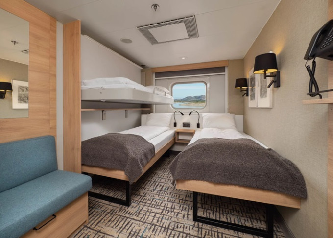 N3 - Vonkajšia kajuta Polar 10 m². Neotvárateľné okno. Oddelené postele + horné lôžko, Tv. 3. paluba. Max 3 osoby. | 3 926 € 1 963 € za osobu | ||