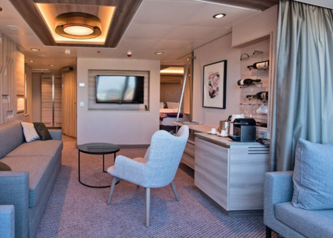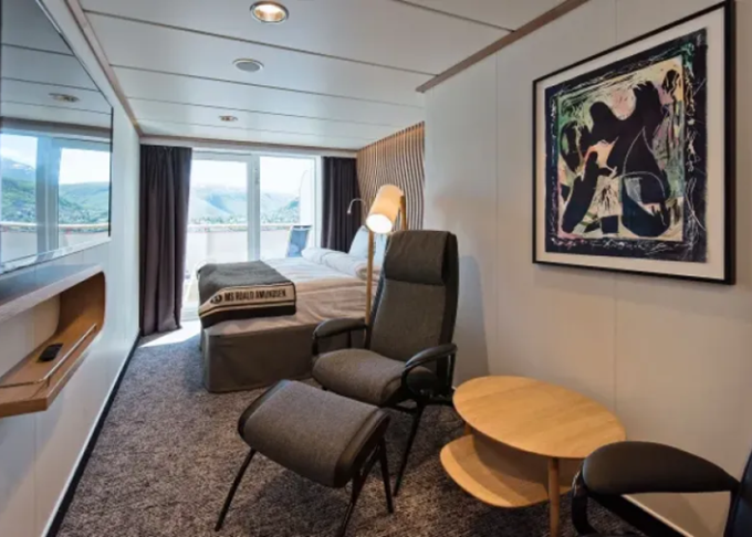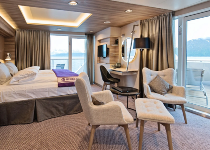 MD - Expedition Large Suite s balkónom ♿ 35 m². Balkón. TV, minibar, varná kanvica, kávovar. Bezbariérová kajuta♿ 7. paluba vpredu. Max 4 osoby. Výhody Suite. | 25 284 € 12 642 € za osobu |