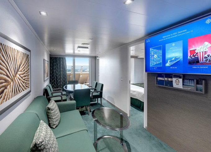 YC4 - Yacht Club Owner's Suite s vírivkou 98 m² + balkón s vírivkou 25 m². Oddelená obývačka a spálňa, šatník, kúpeľňa s vaňou. Kávovar. Max 5 osôb. 19. paluba. Cenový model MSC Yacht Club. | 15 735 € 5 245 € za osobu |