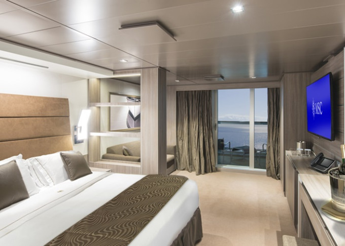 YC1 - Yacht Club Deluxe Suite od 25 m² + balkón 8 m². Spálňa s predelenou obývacou časťou, šatník. Max 5 osôb. 16-19. paluba. Cenový model MSC Yacht Club. | 4 611 € 4 611 € za osobu | ||