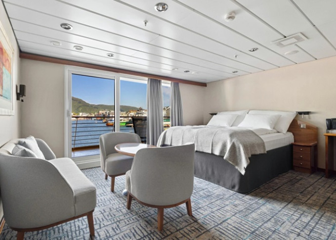 M2 - Expedition Suite na hornej palube s balkónom 23 m². Balkón, obývacia časť, manželská posteľ, TV, varná kanvica, minibar. 7. paluba. Max 2 osoby. Výhody Suite. | 19 290 € 9 645 € za osobu |