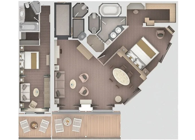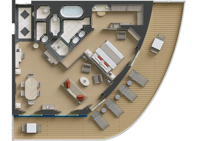 O2 - Owner's Suite 2 119 - 129 m² (vrátane balkóna 12 m²). Owners Suite S1 spojená s Panorama Suite PA 9. paluba - stred. Max 5 osôb. | 70 200 € 23 400 € za osobu |