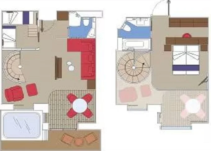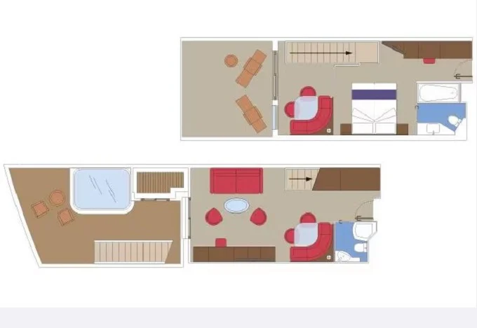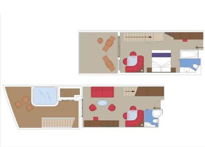 YJD - Yacht Club Duplex Suite s vírivkou 46 m² + balkón 30 m². Vírivka. 2 podlažia, šatník, 2 kúpeľne (1 s vaňou). Max 4 osoby. 16. paluba. Cenový model MSC Yacht Club. | 9 612 € 3 204 € za osobu | ||
