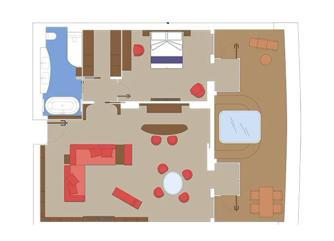 YC3 - Yacht Club Royal Suite s terasou a s vírivou vaňou 51-59 m² / balkón s vírivkou 42-51 m². Oddelená obývačka a spálňa, šatník, kúpeľňa s vaňou. Max 4 osoby. 16/18. paluba. Cenový model MSC Yacht Club. | 19 944 € 4 986 € za osobu |