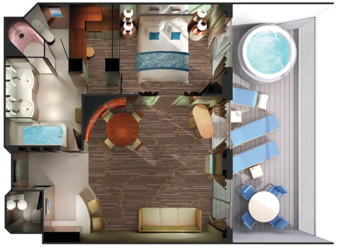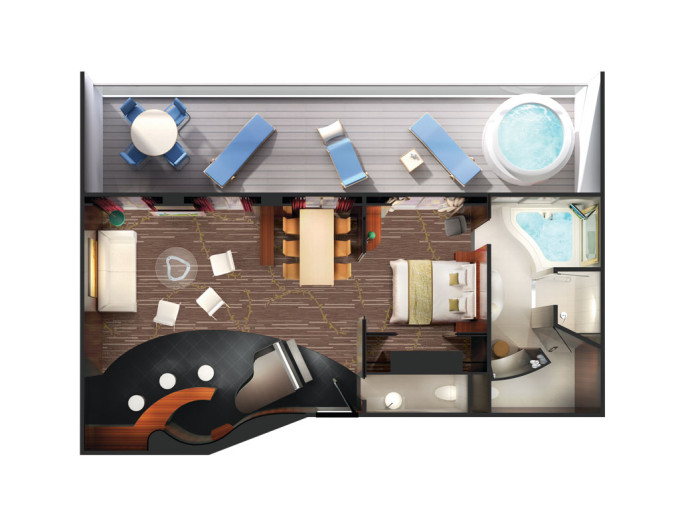 S5 - Deluxe Owner's Suite 128 m² / balkón 45 m². 12. paluba - vpredu. Max 4 osoby. Výhody Suite. | 15 628 € 7 814 € za osobu |