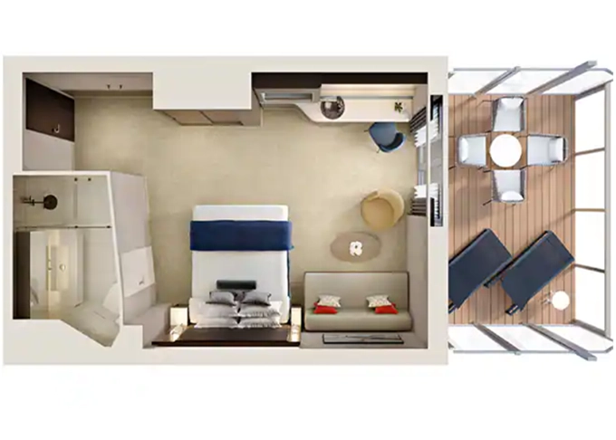 B1 - Kajuta s veľkým balkónom Aft-facing 21 m² / balkón 8 m². 7. až 10. paluba - vzadu. Max 3 osoby. | 7 242 € 3 621 € za osobu | ||