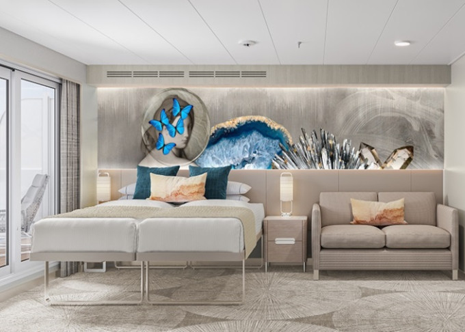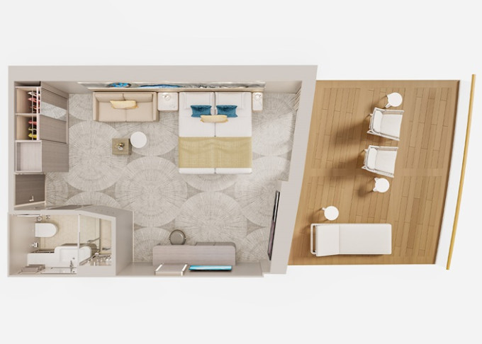 SI - Suite s veľkým balkónom Aft-Facing 41 m² / balkón 18 m². 9. paluba - vzadu. Max 2 osoby. Výhody Suite. | 14 298 € 7 149 € za osobu | ||