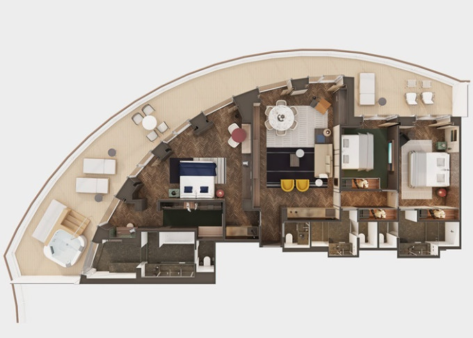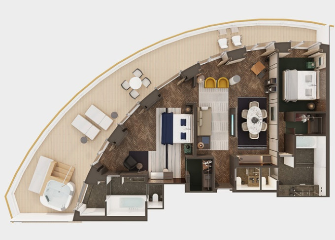 H2 - The Haven Premier Owner's Suite 195 m² / balkón s vírivkou 76 m². 14. paluba - vzadu. Max 8 osôb. Výhody The Haven. | 43 640 € 21 820 € za osobu |