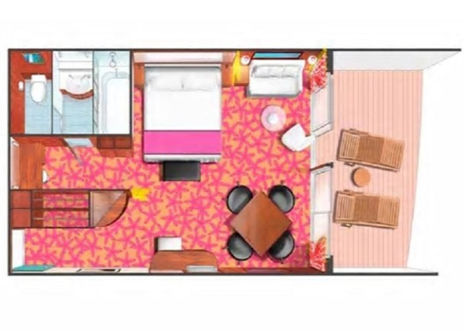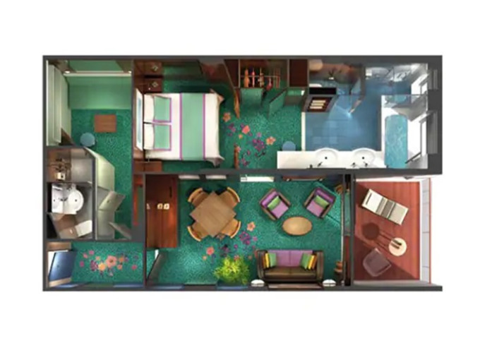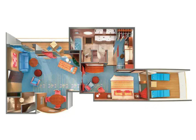 SD - Forward-facing Deluxe Penthouse 46 m² / balkón 13 m². 10. paluba - vpredu. Max 4 osoby. Výhody Suite. | 7 908 € 3 954 € za osobu | ||