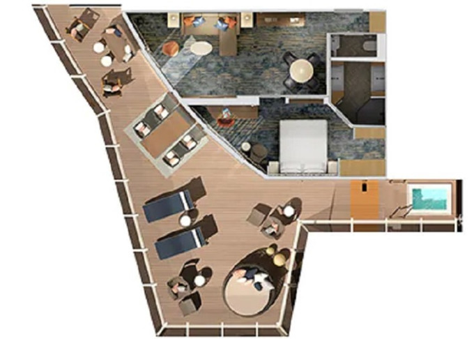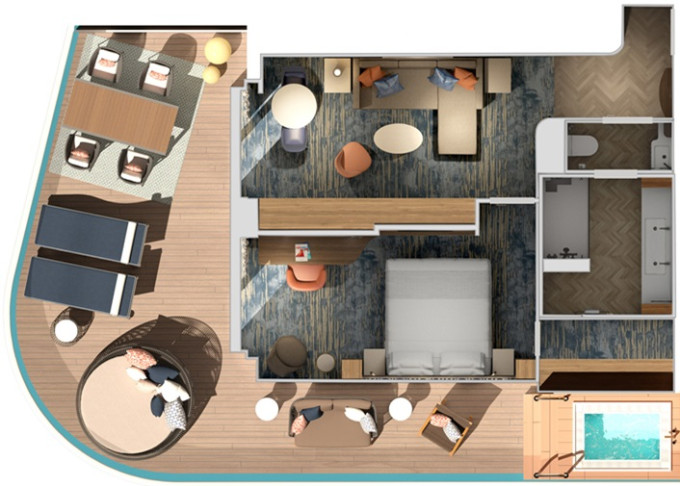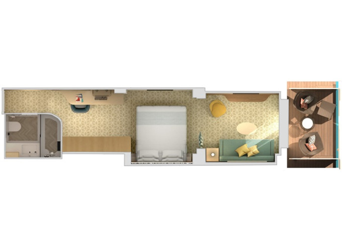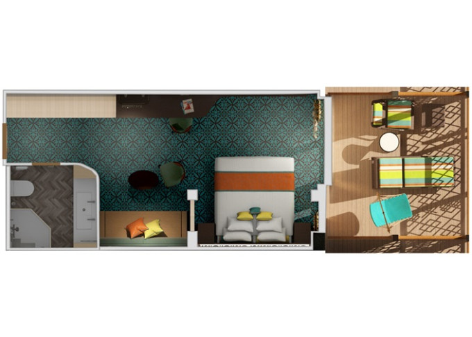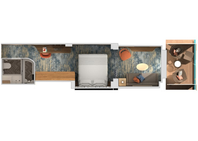 HS - Suite Havana Cabana 28 m² + vonkajšie patio 8 m². 8. paluba vpredu. Tropický štýl, vstup do exkluzívnej zóny Havana. Výhody Suite. Táto kajuta je určená pre hostá od 12 rokov. | 4 222 € 2 111 € za osobu | ||